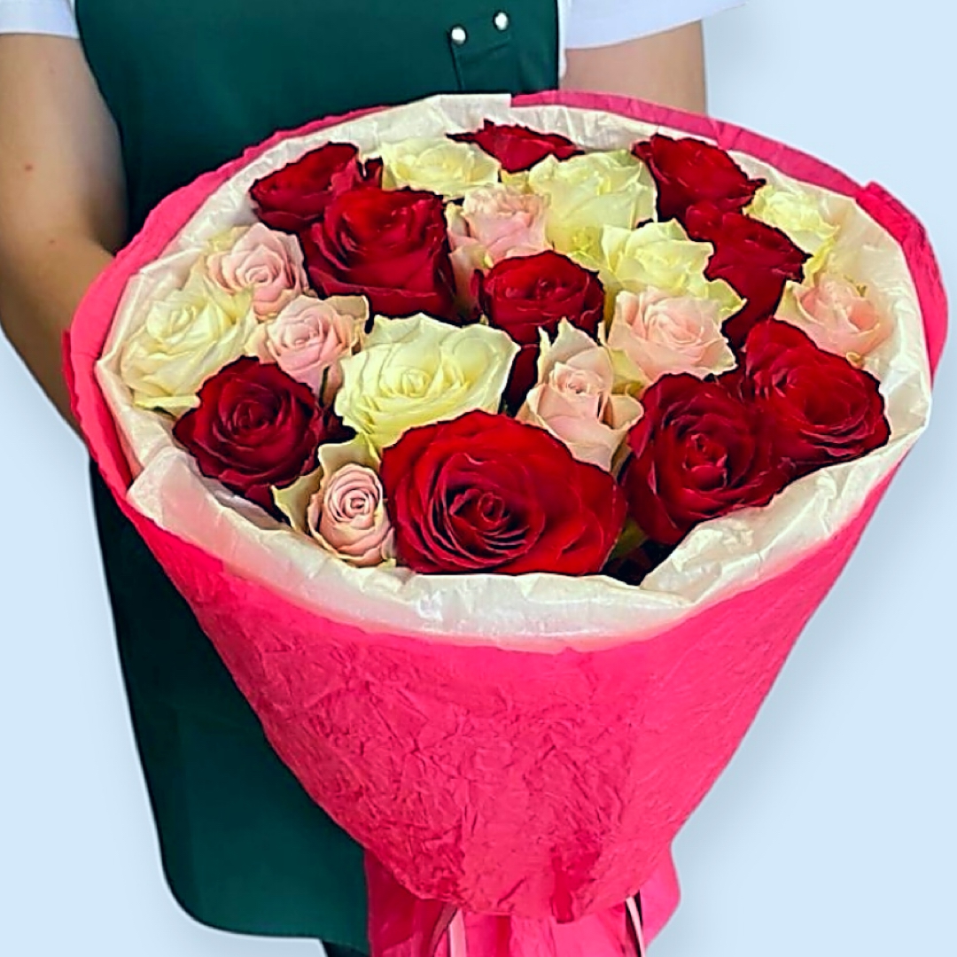 Погрузитесь в мир красок с нашим миксом роз разных цветов! Каждый букет - это уникальная композиция, собранная из самых свежих цветов. Выбирайте идеальную палитру для любого случая: от нежных пастельных тонов до ярких насыщенных красок.