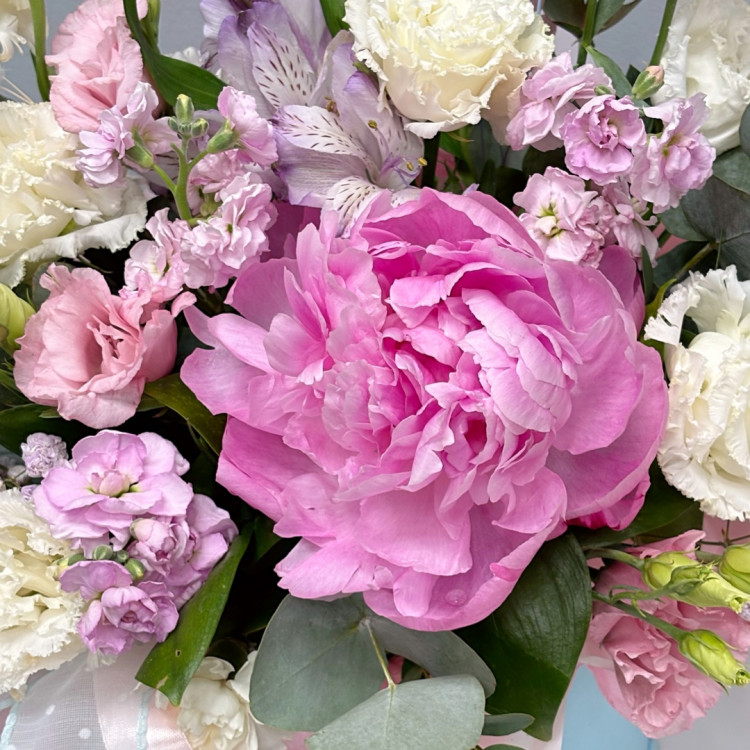 | Состав букета | Пионы - 2 шт, Эустома белая - 2 шт,эустома розовая - 1 шт, маттиола кустовая или одноголовая - 1 шт, альстромерия - 2 шт, гипсофила - 1 шт, эвкалипт - 3 шт, декор, лагурус - 3 шт, Коробочка 16х16, пленка 1 м, пиафлор 1,5 шт, лента |
